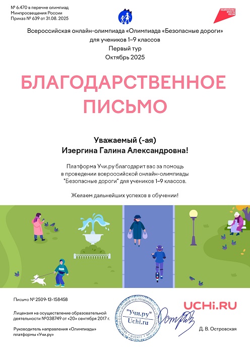 Обучающиеся 8 класса нашей школы приняли активное участие в 1 туре онлайн-олимпиады «Безопасные дороги» на образовательной платформе Учи.ру. Олимпиада «Безопасные дороги» входит в перечень олимпиад, утверждённый приказом Минпросвещения России № 639 от 31 августа 2025 года (№ 6.470). Данное мероприятие помогает освежить и закрепить знания правил дорожного движения и повысить дорожную грамотность школьников 1-9 классов.